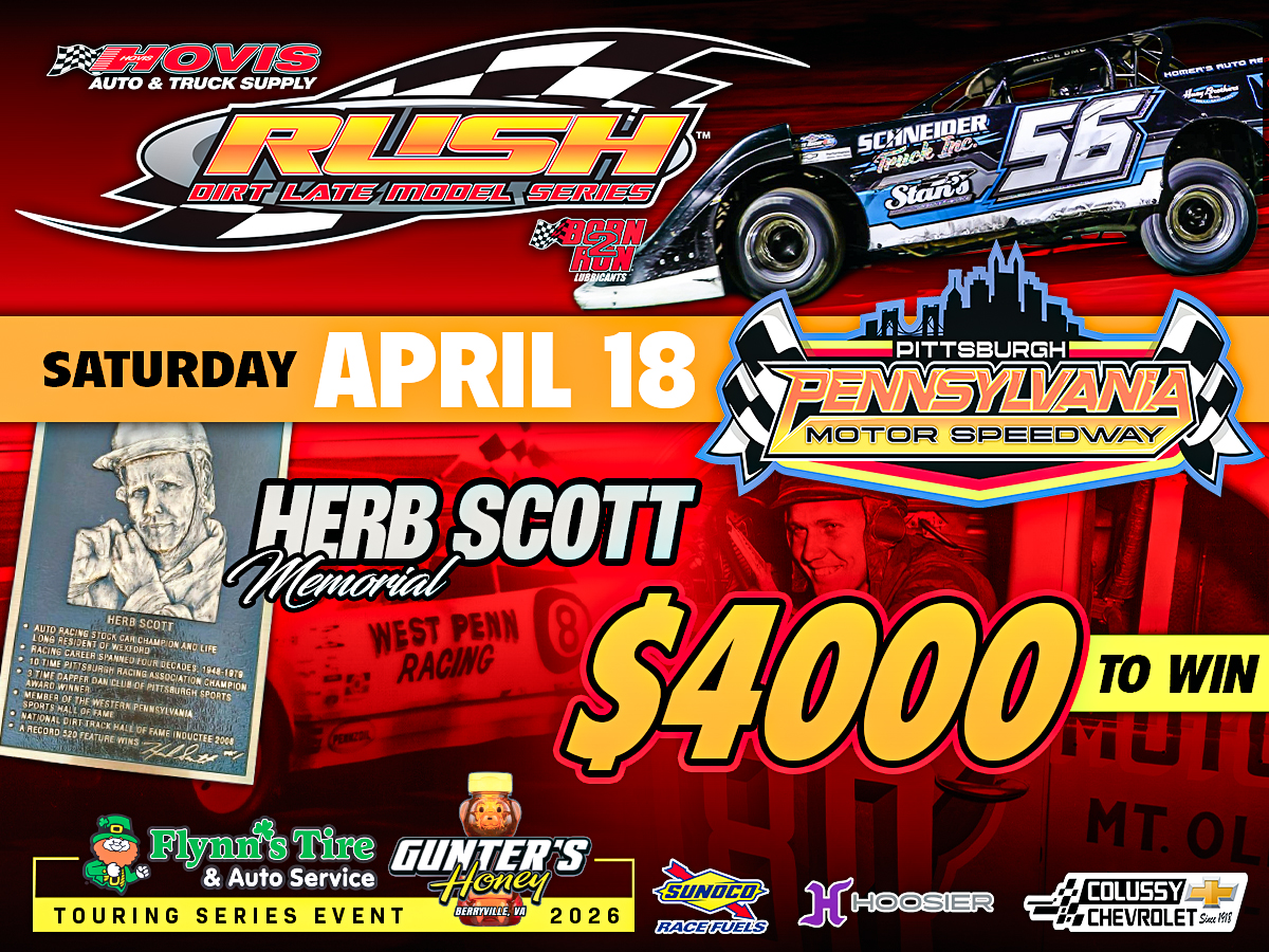 WEDNESDAY aPRIL 15TH...PITTSBURGH TO HOST 2026 HOVIS RUSH LATE MODEL FLYNN'S TIRE/GUNTER'S HONEY TOURING SERIES OPENER THIS SATURDAY WITH THE "HERB SCOTT MEMORIAL"