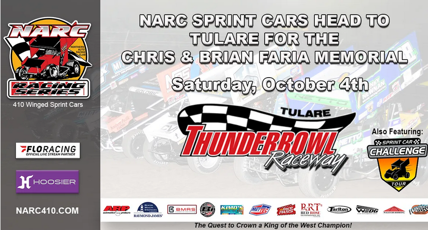 Tuesday September 30th...The closing stretch of the 2025 NARC King of the West sprint car season is upon us. The first of four races in five weeks is this Saturday as the NARC teams tackle the famous Thunderbowl Raceway in Tulare for the Chris & Brian Faria Memorial.  This action-packed racing card will also feature the Sprint Car Challenge Tour 360's.