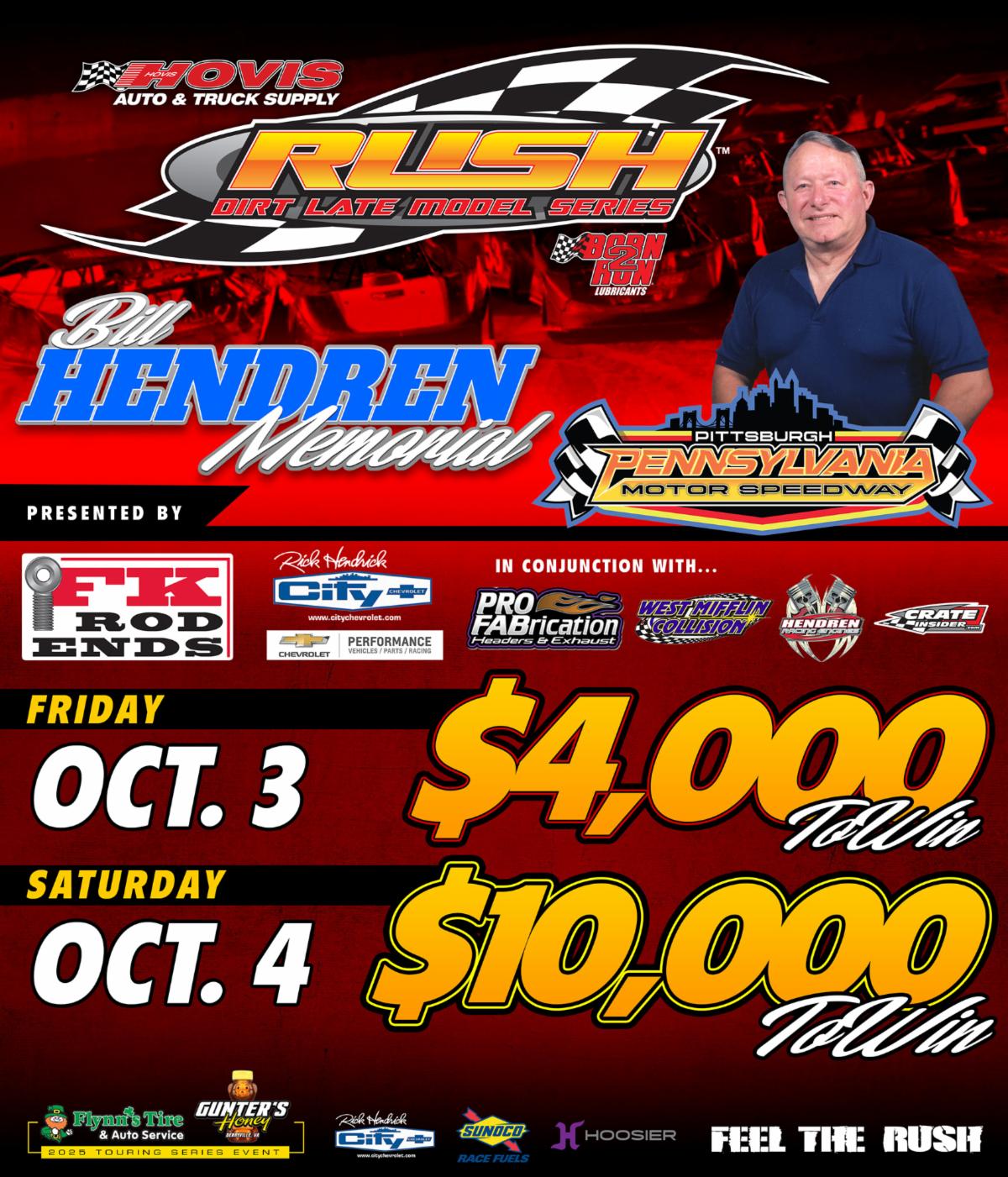 "BILL HENDREN MEMORIAL" PRESENTED BY FK ROD ENDS & CITY CHEVROLET SET FOR THIS WEEKEND AT PITTSBURGH; $4000 TO-WIN FRIDAY & $10,000 TO-WIN SATURDAY FOR HOVIS RUSH LATE MODEL FLYNN'S TIRE/GUNTER'S HONEY TOUR PART OF THE "PITTSBURGHER"