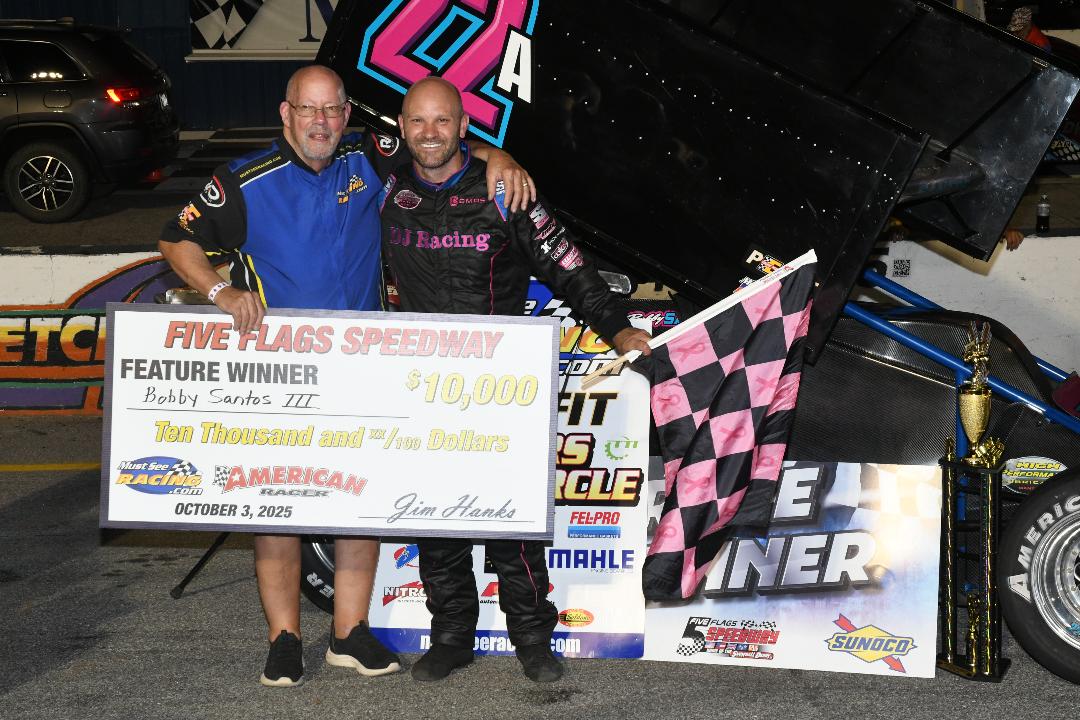 Friday October 3rd...By pulling the outside front-row starting spot in the feature redraw, Bobby Santos converted his night-long speed at Five Flags Speedway into a $10,000 Must See Racing Perfit Sprint Car Series victory Friday.