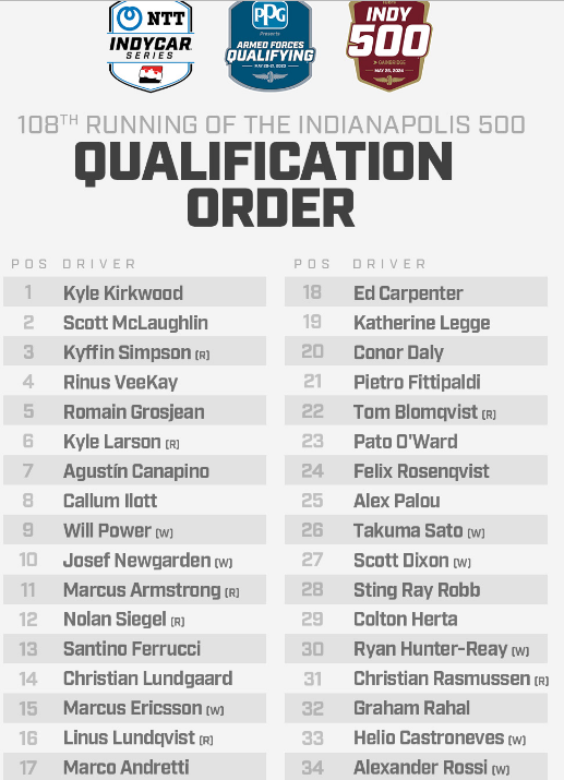 Christian Rasmussen was the top-finishing rookie, 12th in the No. 33 Ed Carpenter Racing Chevrolet. 2021 NASCAR Cup Series champion Kyle Larson finished 18th in the No. 17 Hendrickcars.com Arrow McLaren Chevrolet in his first “500” start, hampered by a pit road speeding penalty.