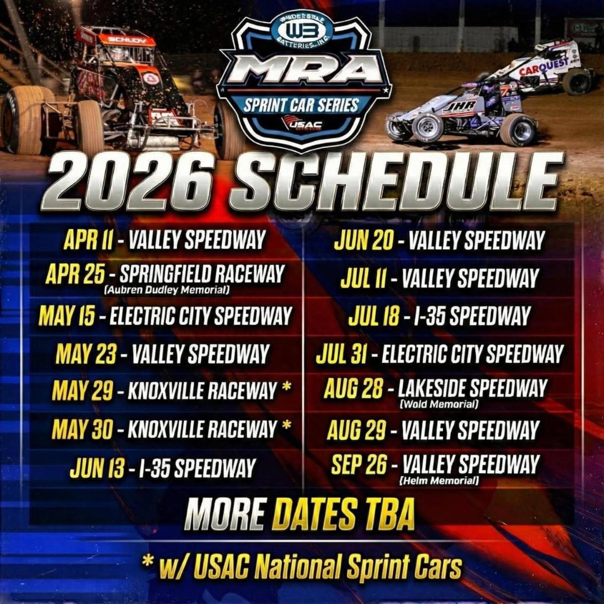 Strafford, Missouri (December 30, 2025)………The USAC Wholesale Batteries Midwest Racing Association Sprint Car Series will begin competition in 2026 featuring a 14-race schedule with additional dates yet to be announced.
