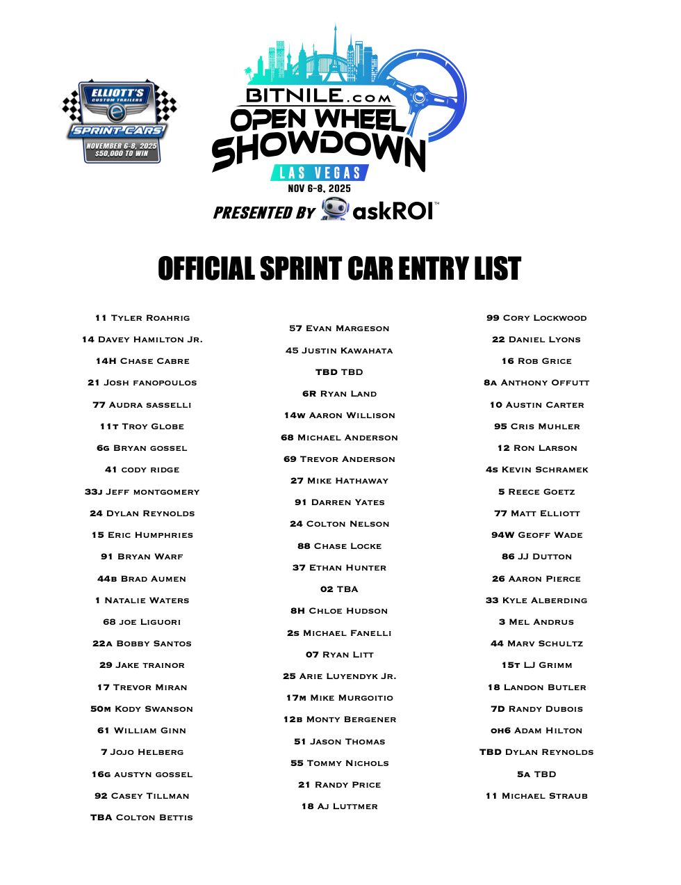 September 26, 2025 - Las Vegas, Nevada - Bitnile.com Open Wheel Showdown Presented by askROI officials today confirmed that all 70-winged sprint car entries for the November 6-8 event have been filled. Any additional entries will be placed on a waiting list.