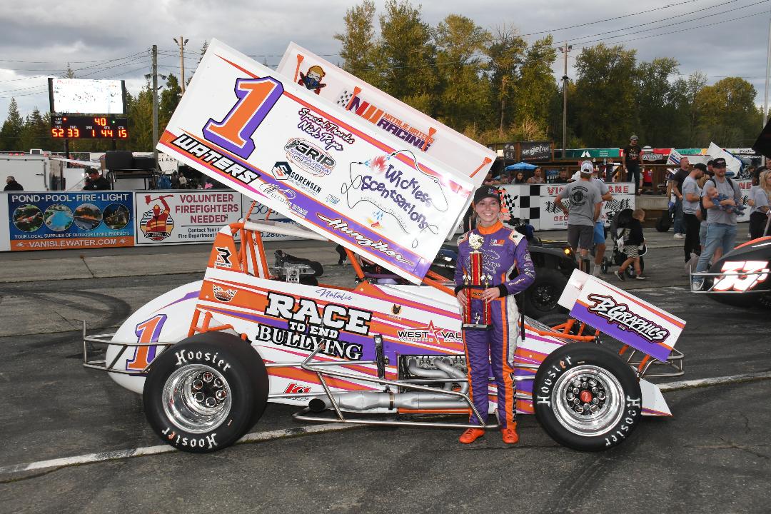 Waters ventured up to Vancouver Island, Canada for the Neil Montgomery Memorial at Saratoga Speedway in August. When the dust had settled, she found herself with a podium finish in the richest pavement sprint car race in Canada, further enhancing her confidence this year.